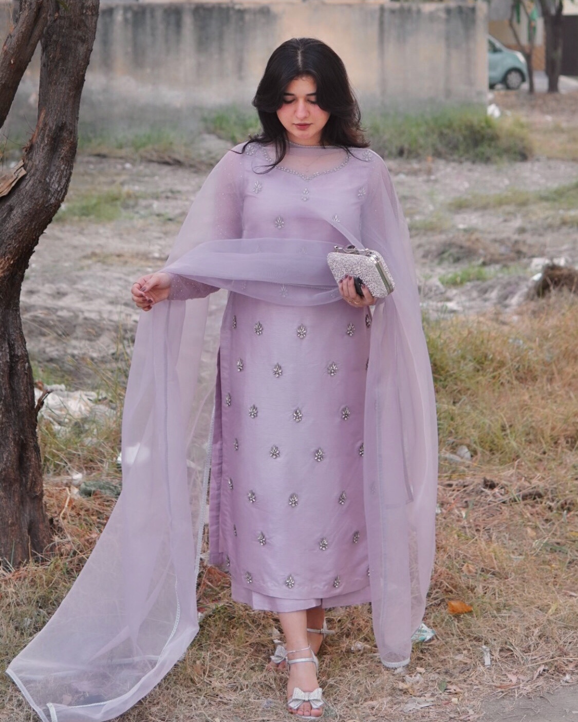 - ‘Aarzu’ Stunning Lilac Fused Raw Silk 3-Piece Dress with Intricate Stone Work! This elegant ensemble features delicate stone detailing on the neckline and throughout the dress, complemented by organza dupatta adorned with silver lace. Complete with stylish plazo pants, this outfit is perfect for Eid occasion. Stand out in sophistication and grace with this exquisite ensemble