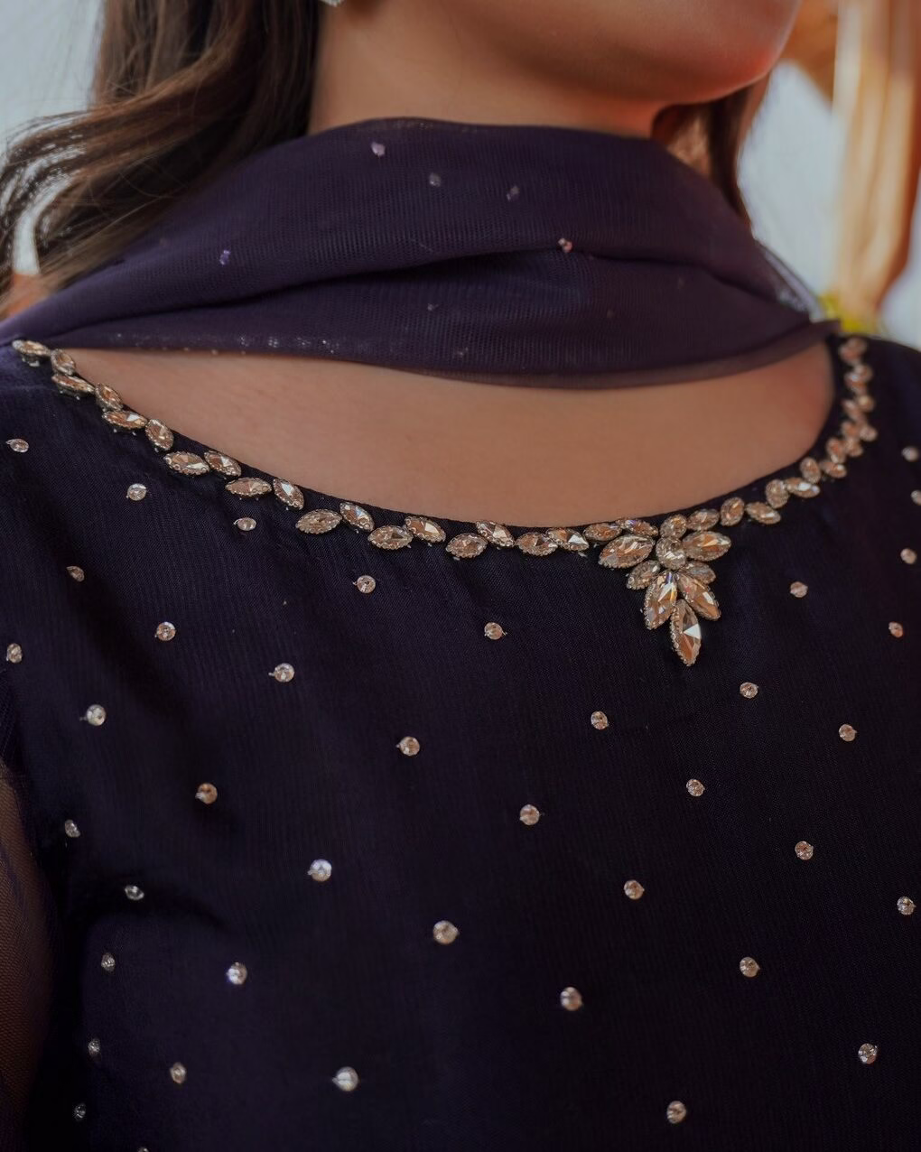 Introducing Mirha – a masterpiece of elegance! Featuring intricate handmade embellishments, a stunning stone-adorned neckline, a delicately sprayed shalwar patch, and graceful net sleeves paired with a net dupatta. This outfit blends traditional craftsmanship with modern glamour, making it perfect for formal occasions.