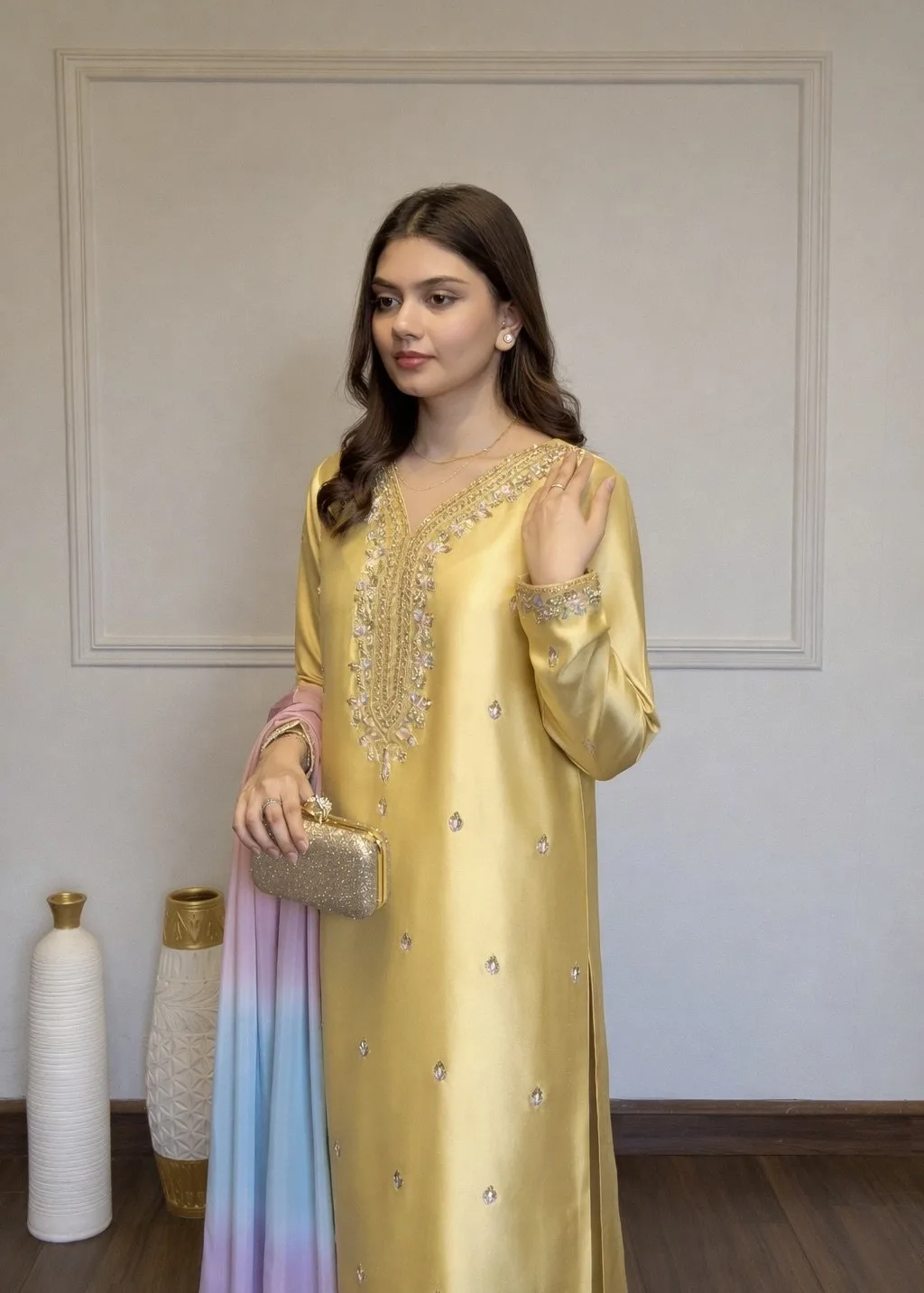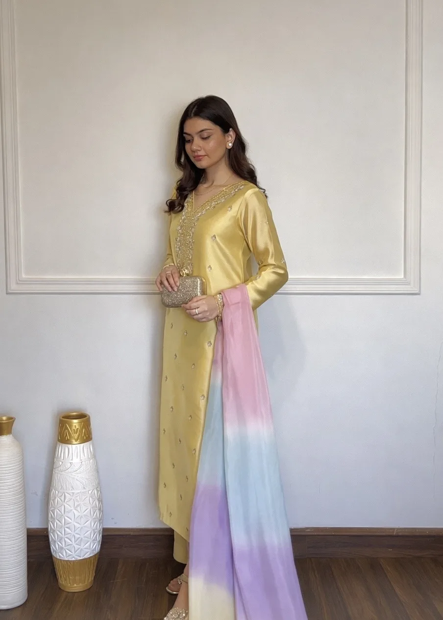 Satrangi – It’s a perfect choice for Eid, made with beautiful dyed Sheesha silk, handmade embroidery and handwork, paired with a 4 colour medium silk dupatta and Russian silk plazo for a complete festive look.