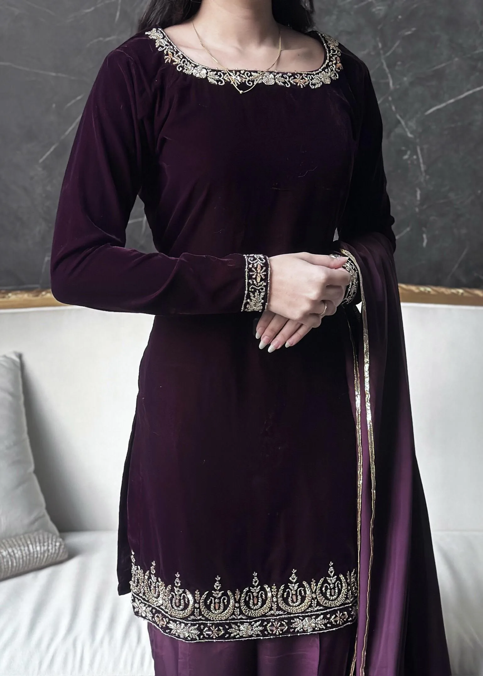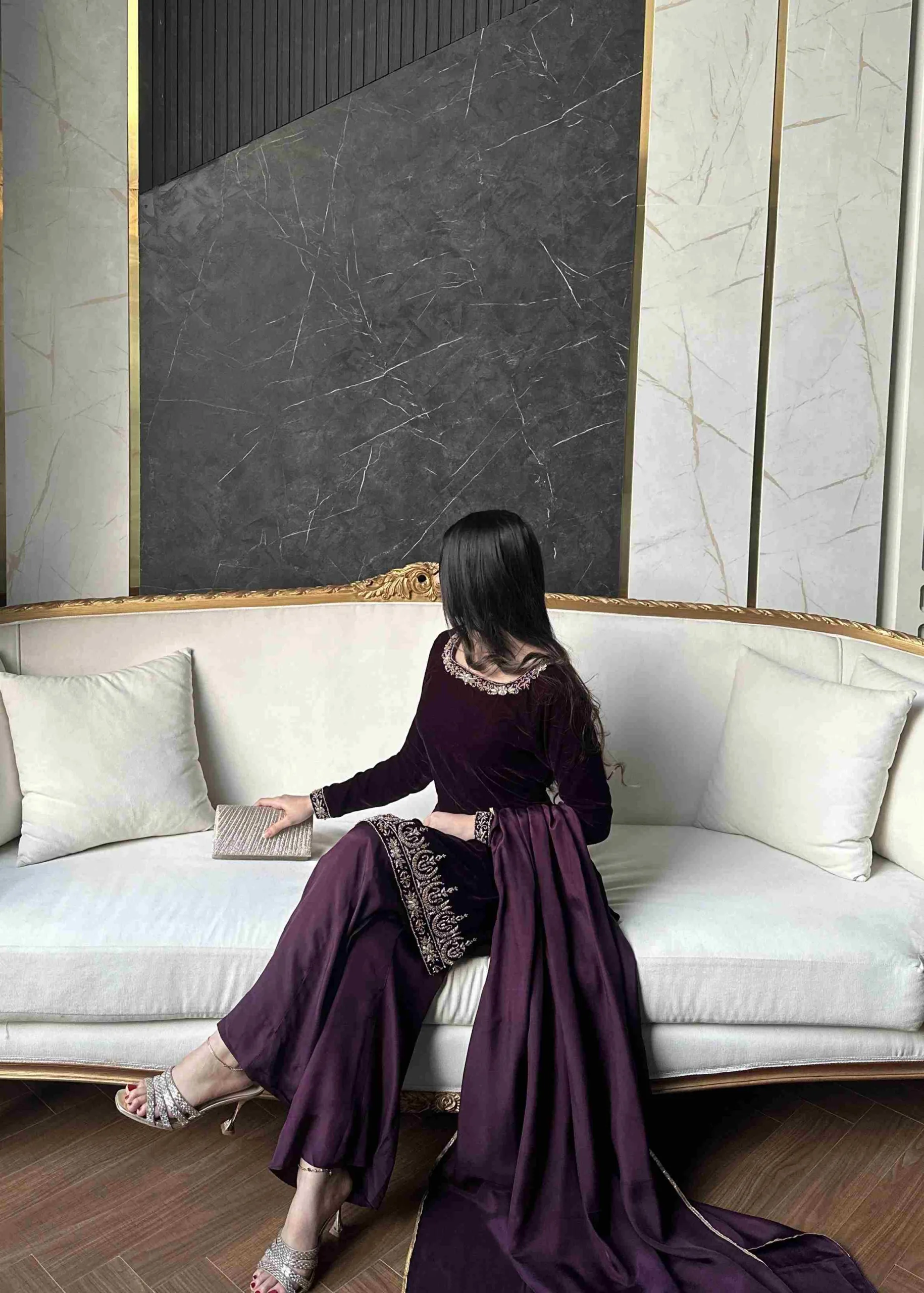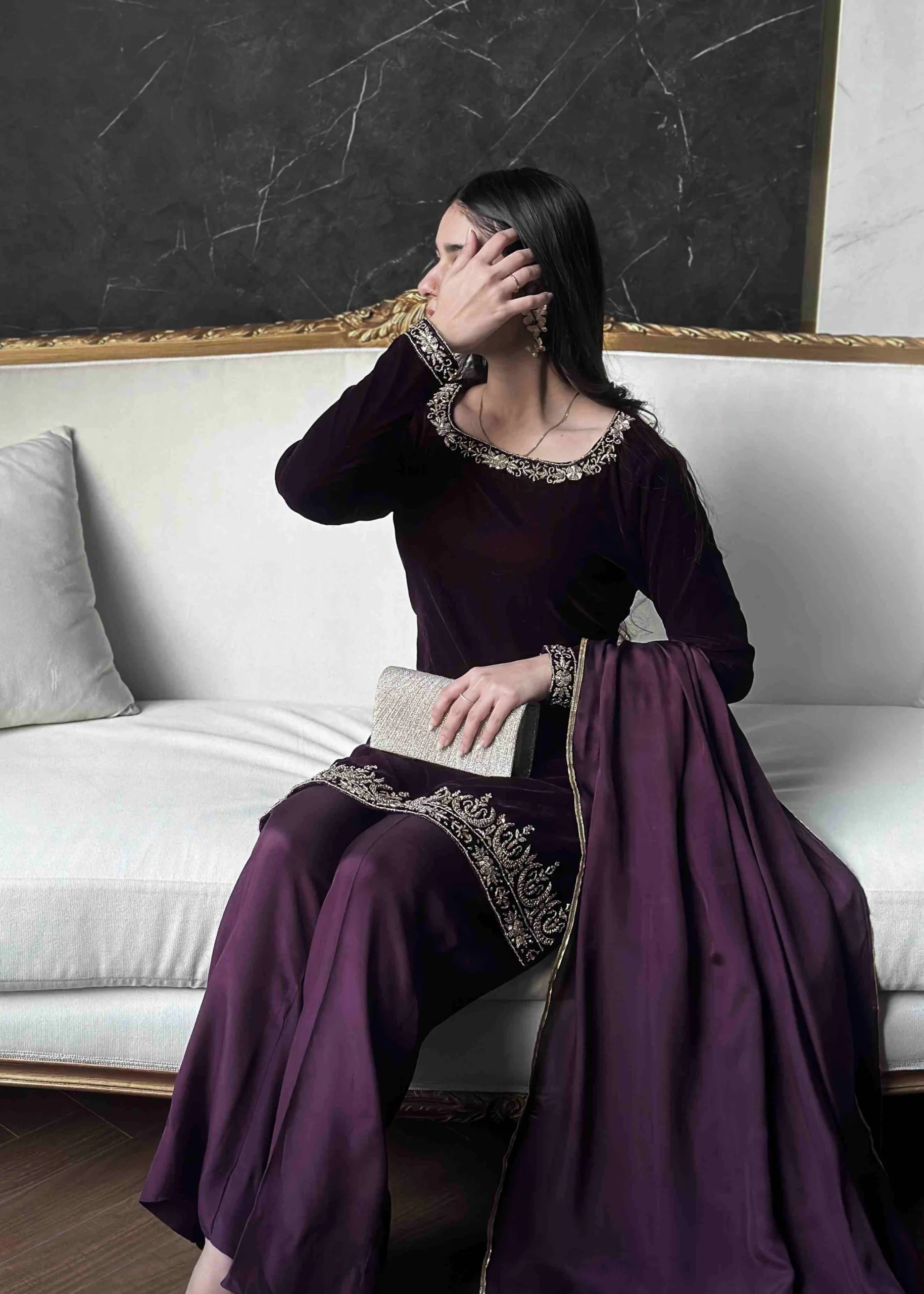 - Zarmine — our velvet dress features a hand-embellished velvet shirt, paired with elegant bell-bottom and dupatta beautifully dyed in Russian silk.