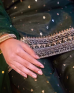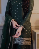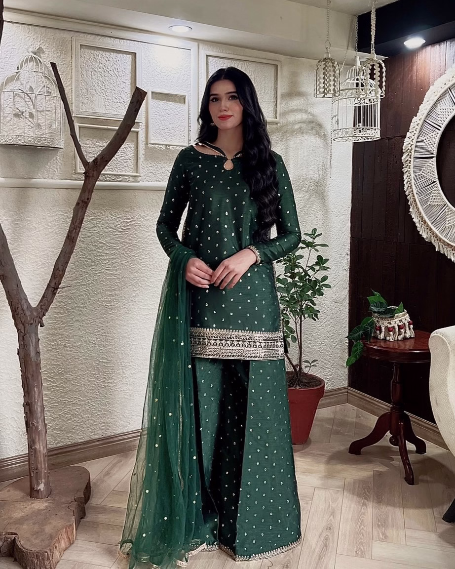 - “Zebaish” – a bottle green raw silk ensemble featuring a short kameez and flared plazo with sitara embroidery. The unique neckline and dyed net dupatta with golden maqaish work make it a perfect festive pick.